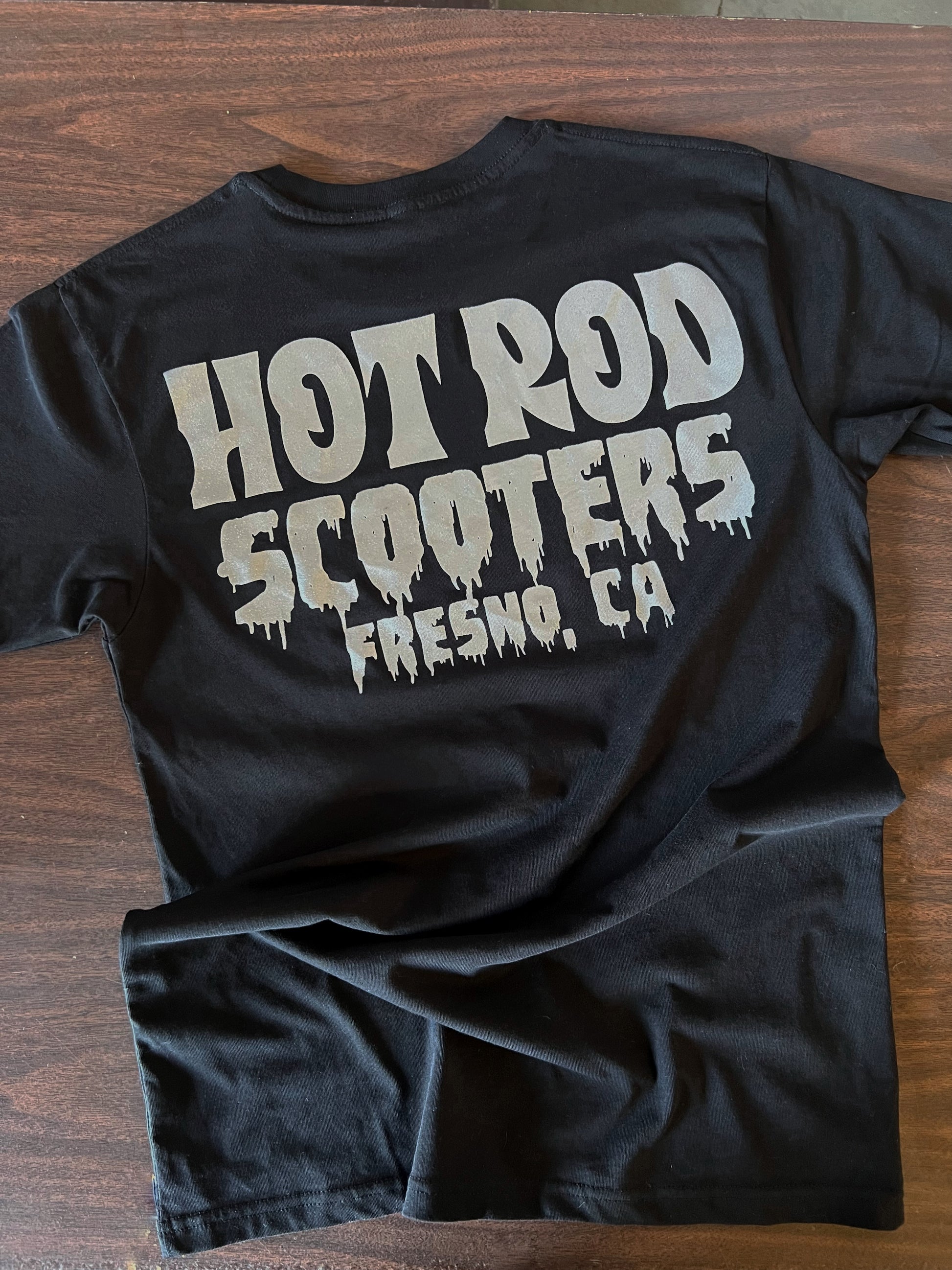 Our Retro Rocket T-Shirt is made of 100% combed cotton. Retro Rocket logo on the front, Hot Rod Scooters logo in silver on the back.